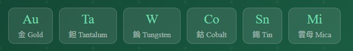 1. 重申本公司及供應商願共同負起社會與環境保護的責任,絕不接受來自剛果及鄰近衝突地區非法開採之金(Au)、鉭(Ta)、鎢(W)、鈷(Co)、錫(Sn) 及雲母(Mica)。